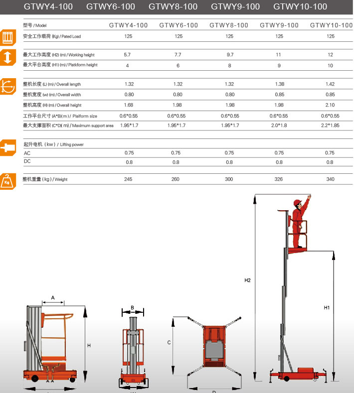 桅柱式升降平臺主體結(jié)構(gòu)采用新型高強度鋁合金型材制作,緊密配合,垂直升降,故高位作業(yè)時整機偏轉(zhuǎn)和擺性極小。具有造型美觀、體積小、重量輕、移動方便、升降平穩(wěn)、安全可靠等優(yōu)點。