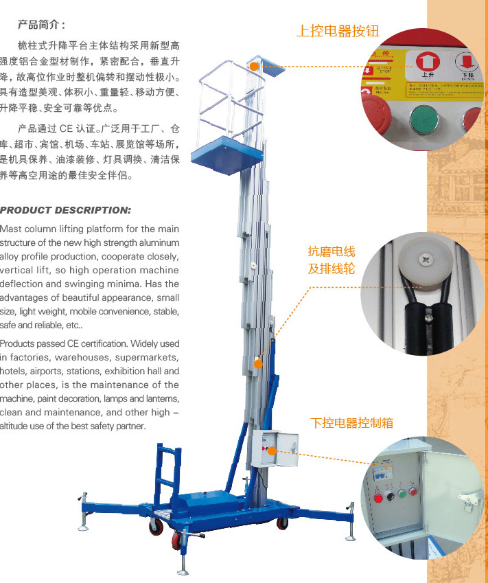 產(chǎn)品通過CE認證。廣泛應(yīng)用于工廠、倉庫、超市、賓館、機場、車站、展覽等場所,是機具保養(yǎng)、油漆裝修、燈具調(diào)換、清潔保養(yǎng)等高空用途的最佳安全伴侶。